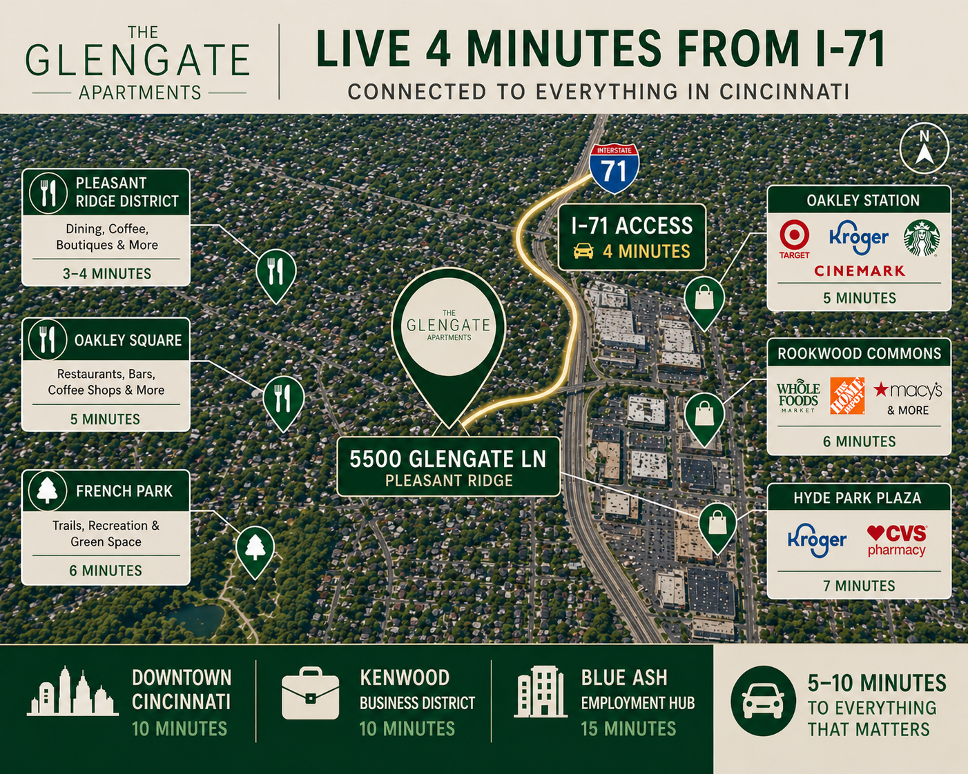 Located at 5500 Glengate Lane in Pleasant Ridge, The Glengate Apartments offer convenient access to I-71, neighborhood restaurants, parks, shopping, and major Cincinnati destinations.